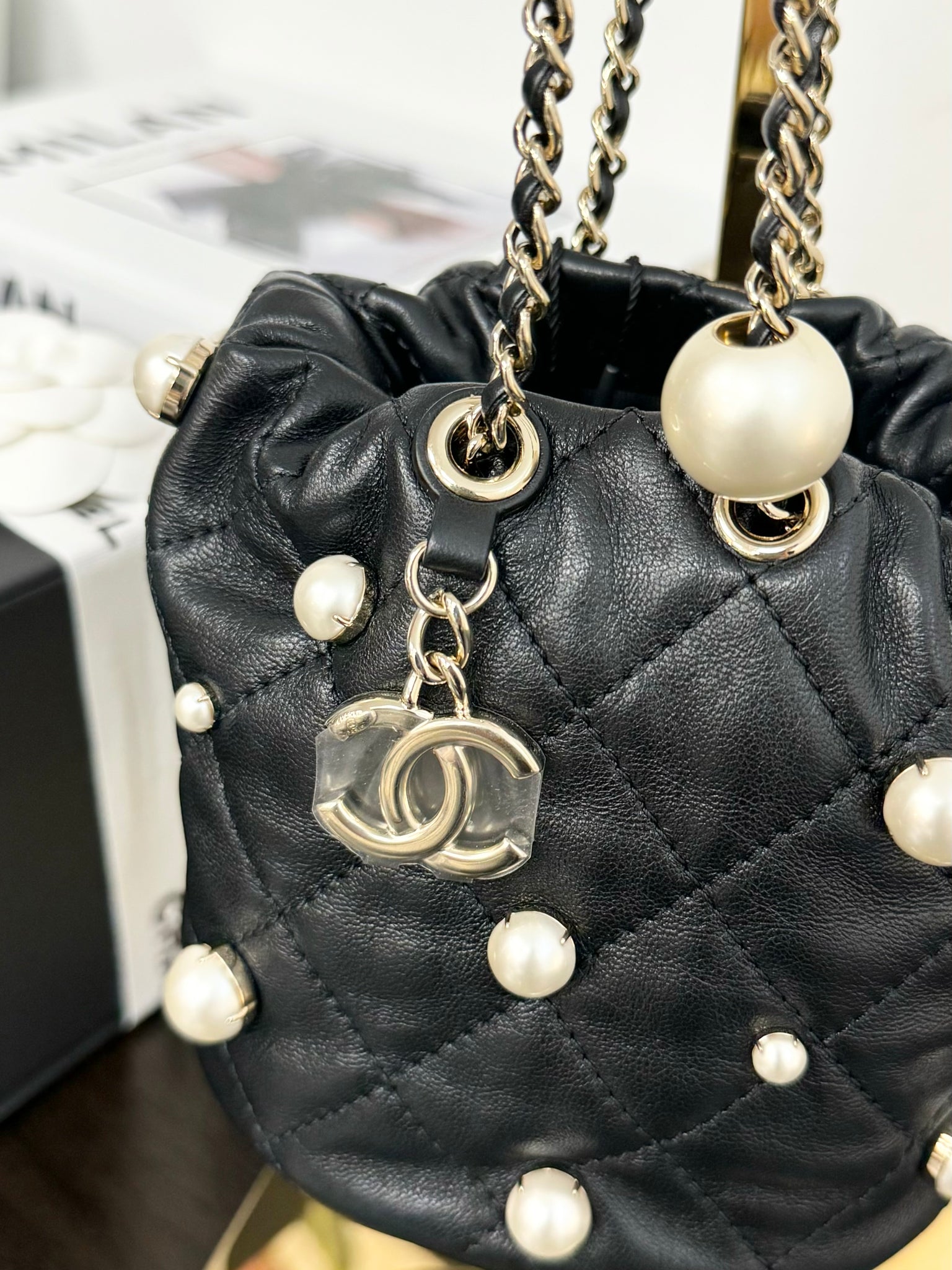 - Interlocking CC Logo, Faux Pearl Accents, Quilted Pattern & Chain-Link Accent