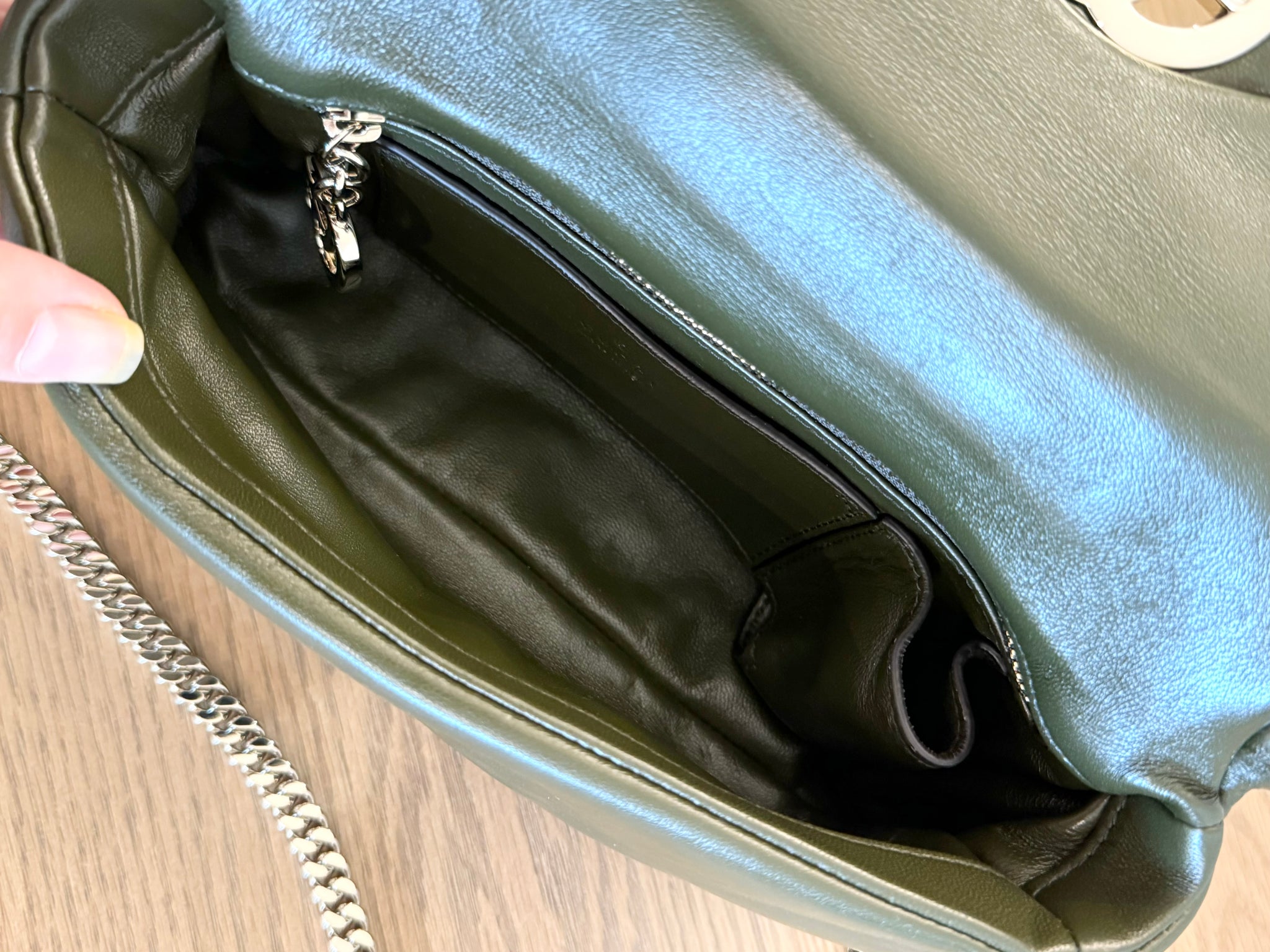 - Dark olive green leather lining