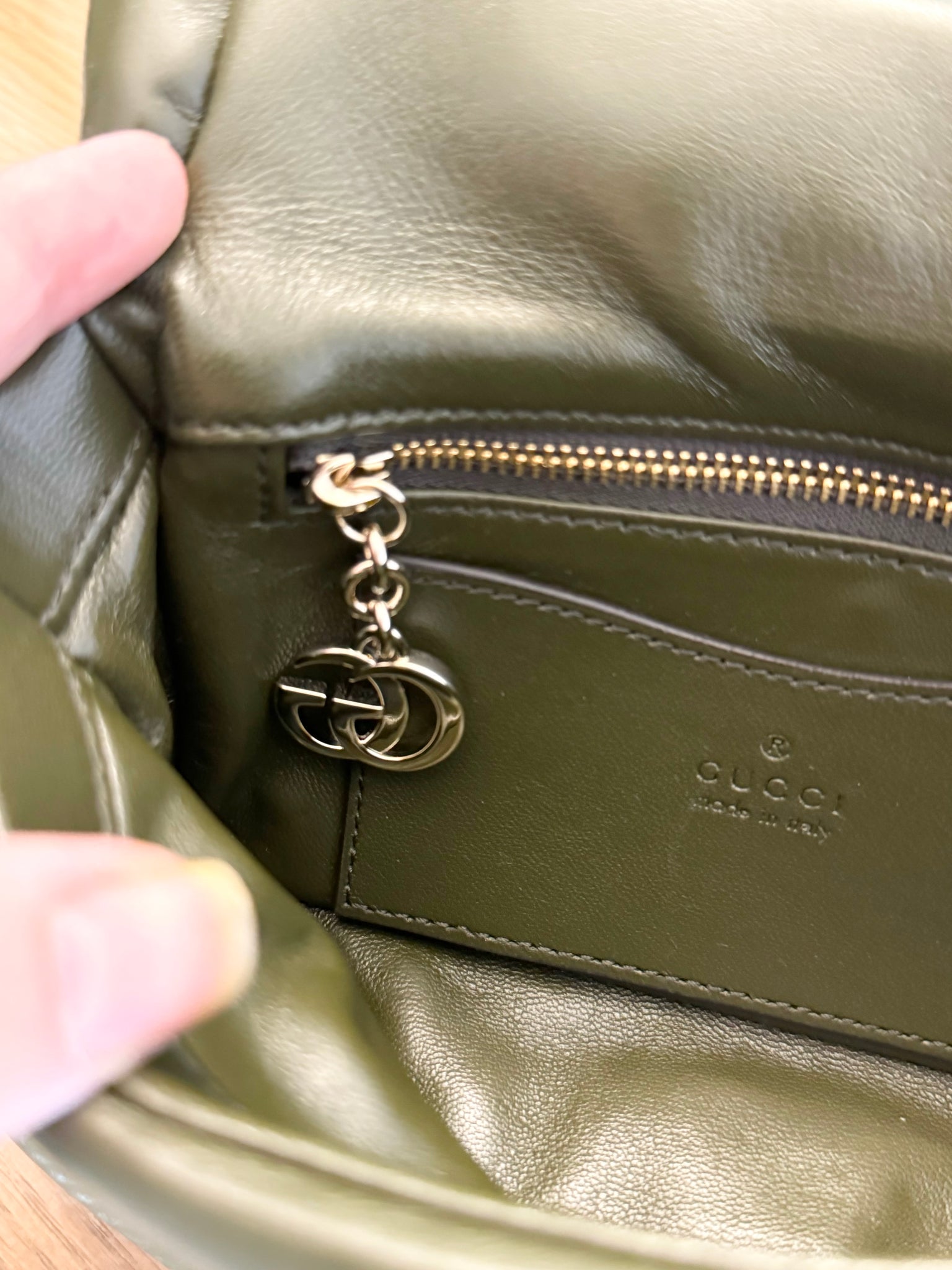 - 1 zip pocket with GG charm, 1 open pocket and 1 lipstick holder compartment