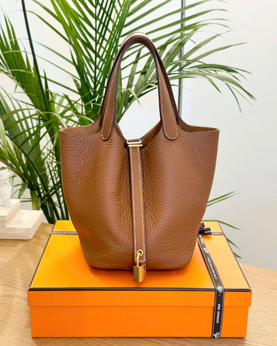 [SOLD] HERMES Taurillon Clemence Picotin Lock 18 PM Bucket Bag in Gold