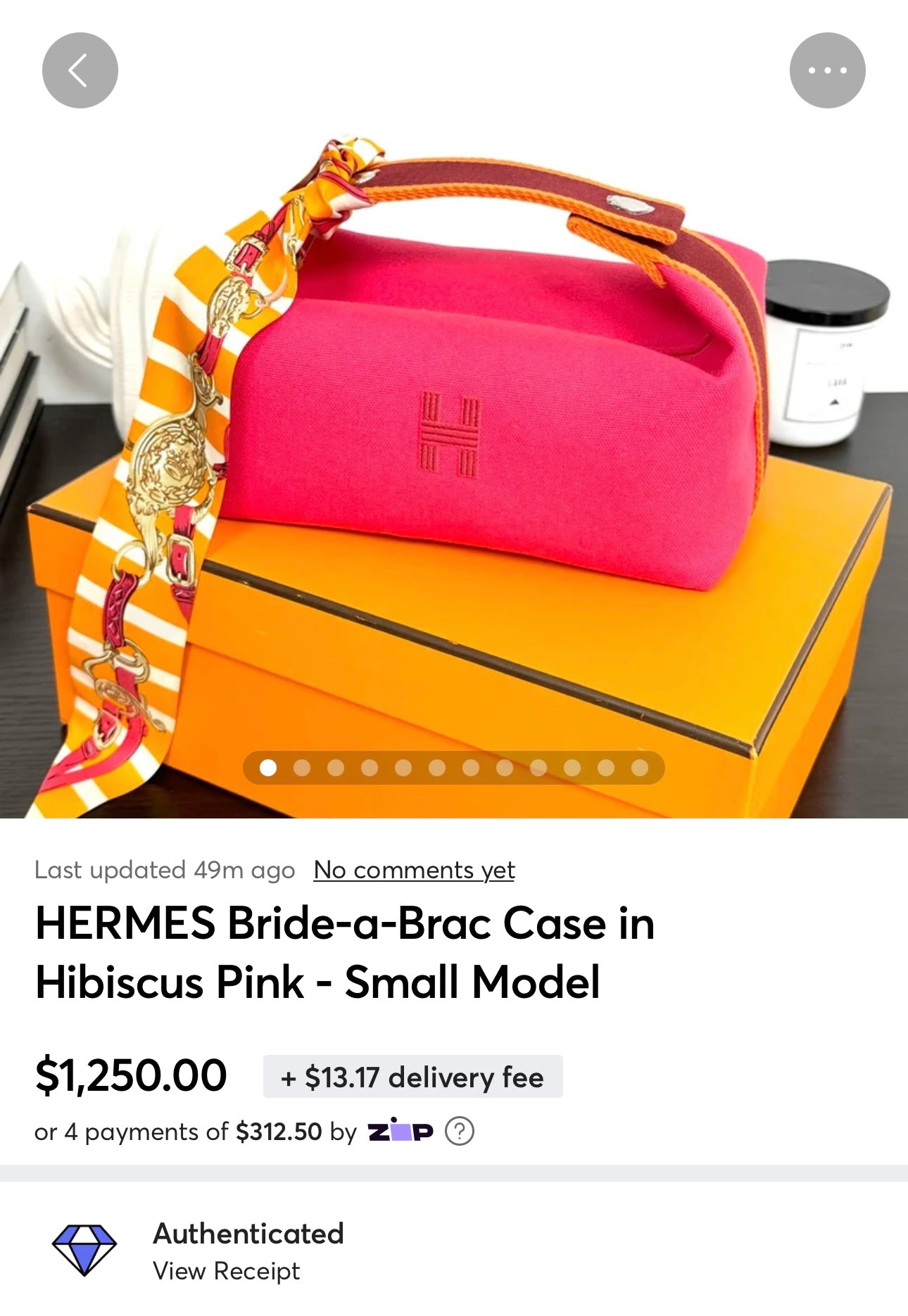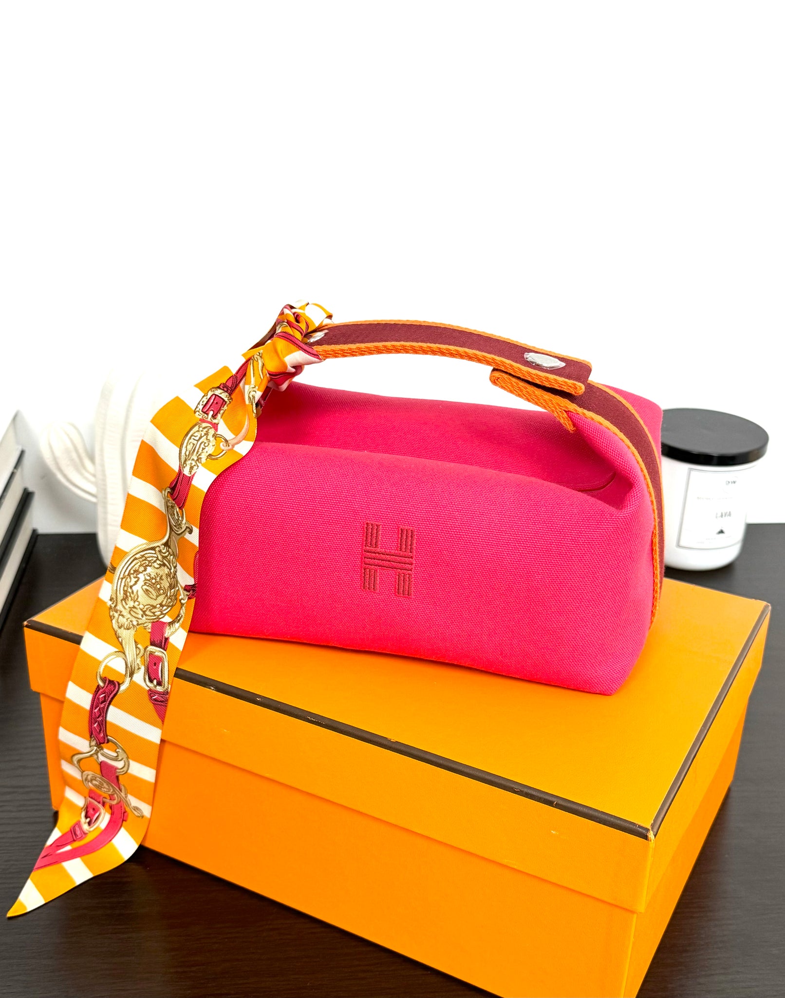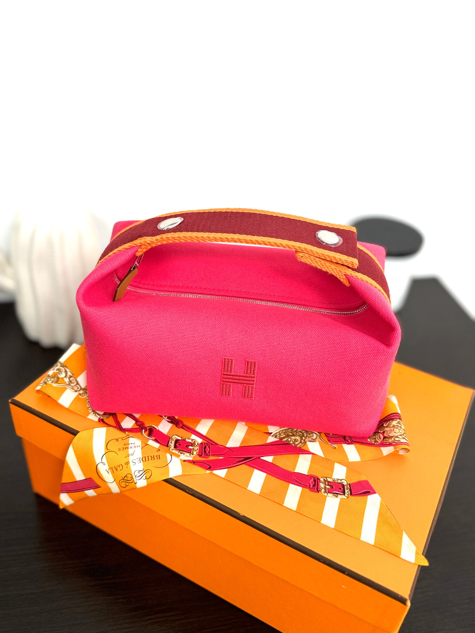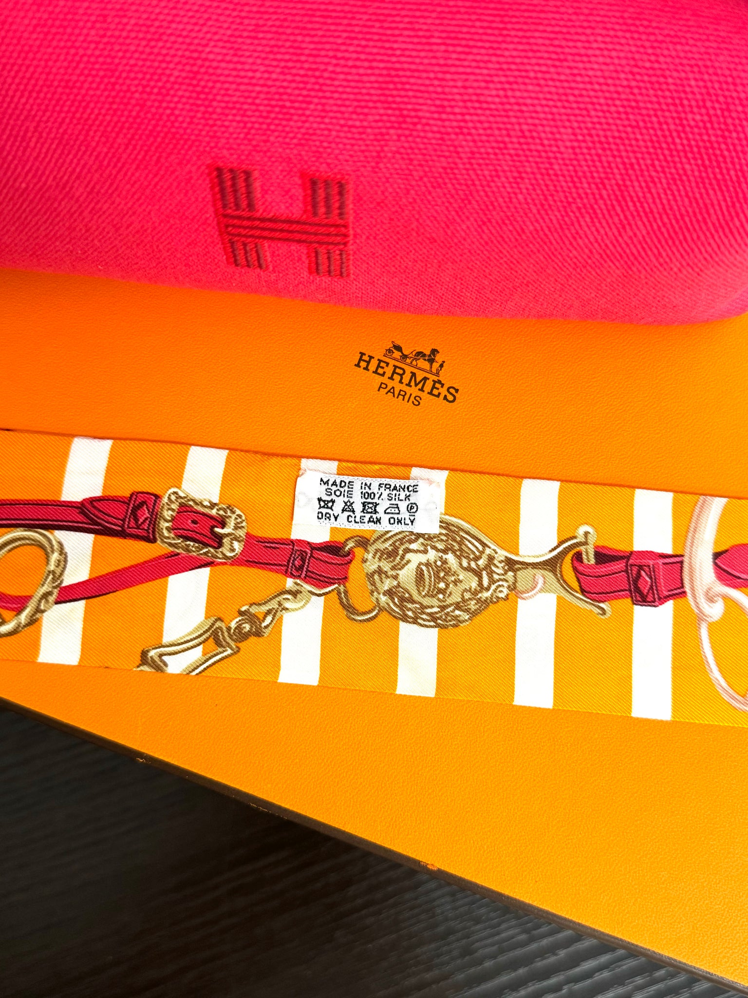 - Includes: Gently used Hermes Brides de Gala Bayadere Silk Twilly Bandeau