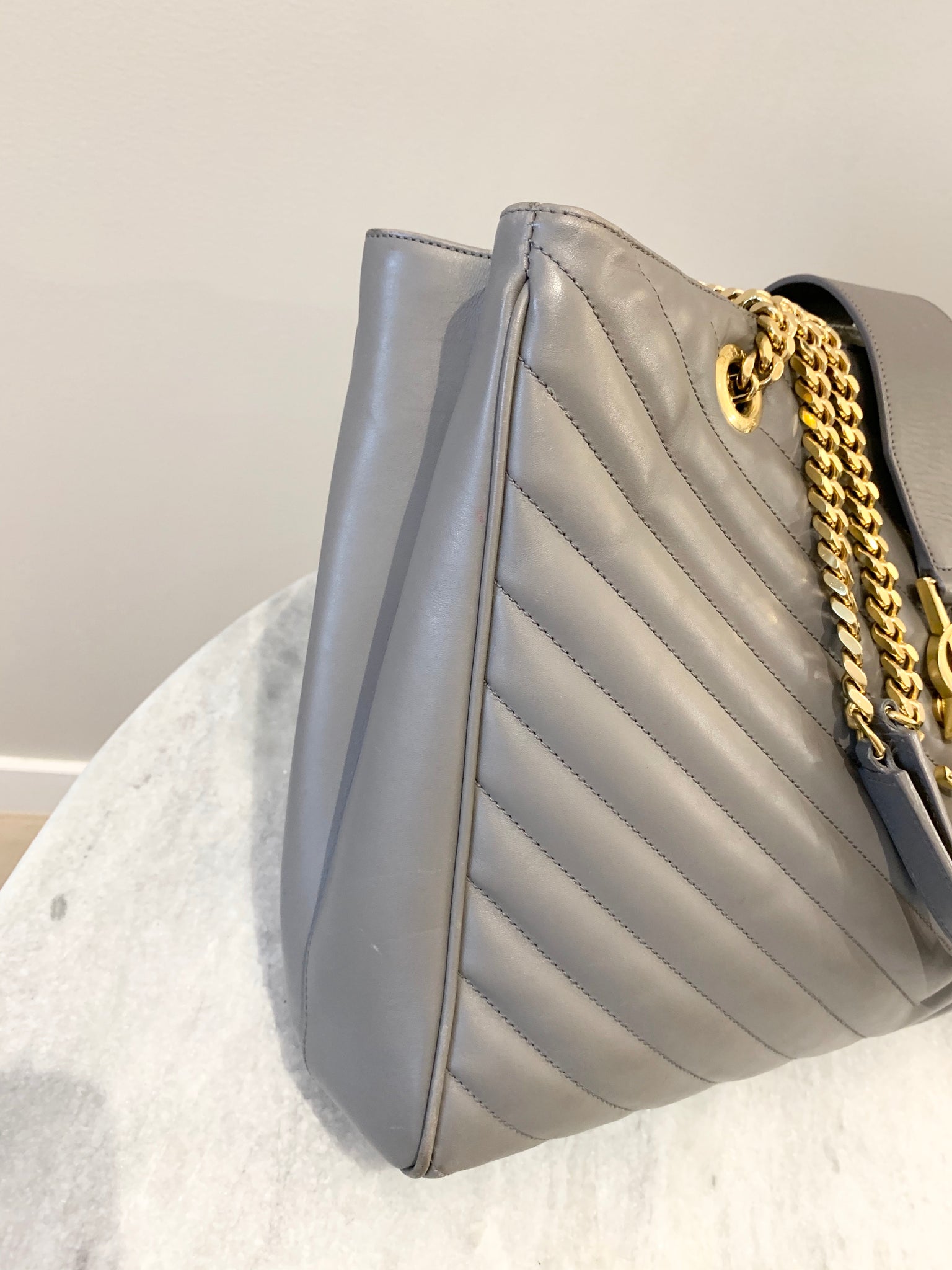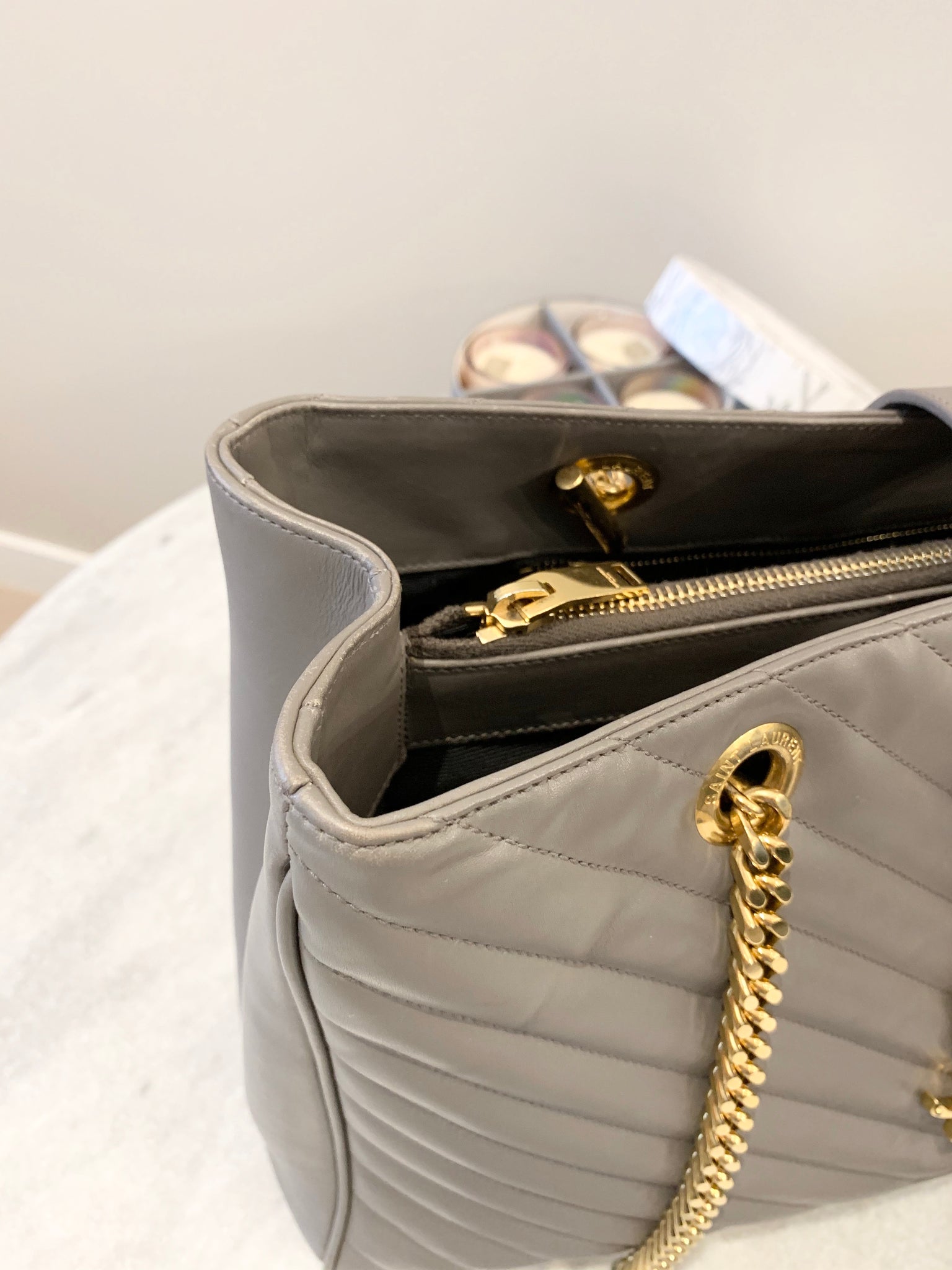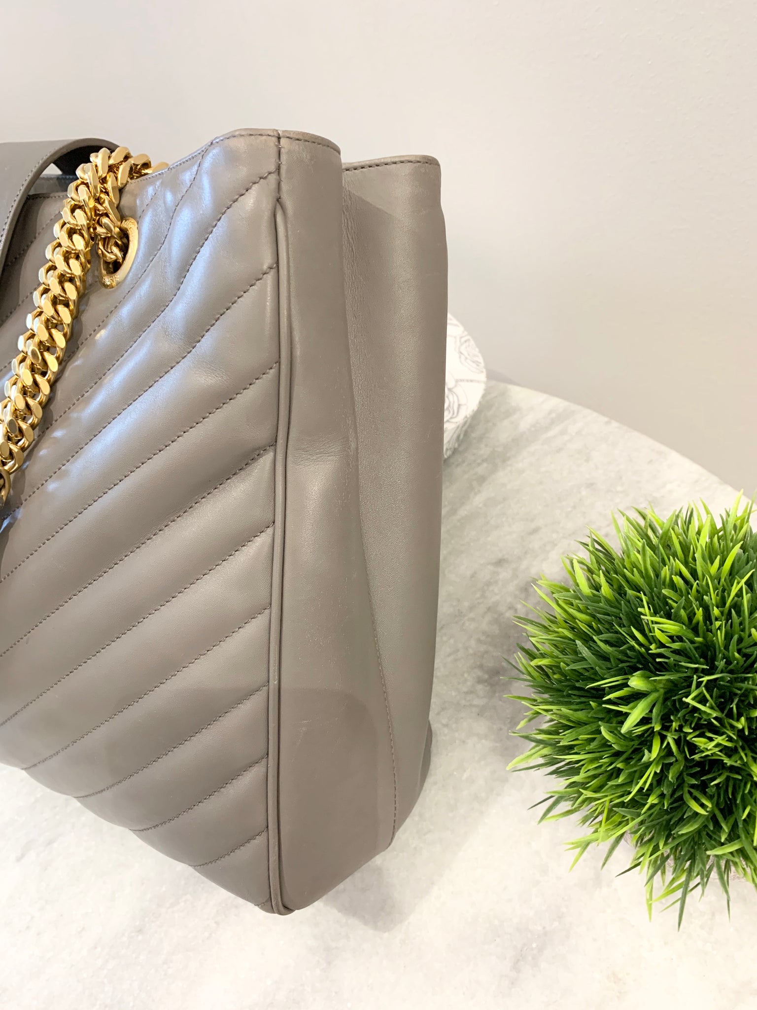 • Load image into Gallery viewer, SAINT LAURENT Quilted Grained Leather Monogram Chain Bo Cassandre Tote Bag In Grey
